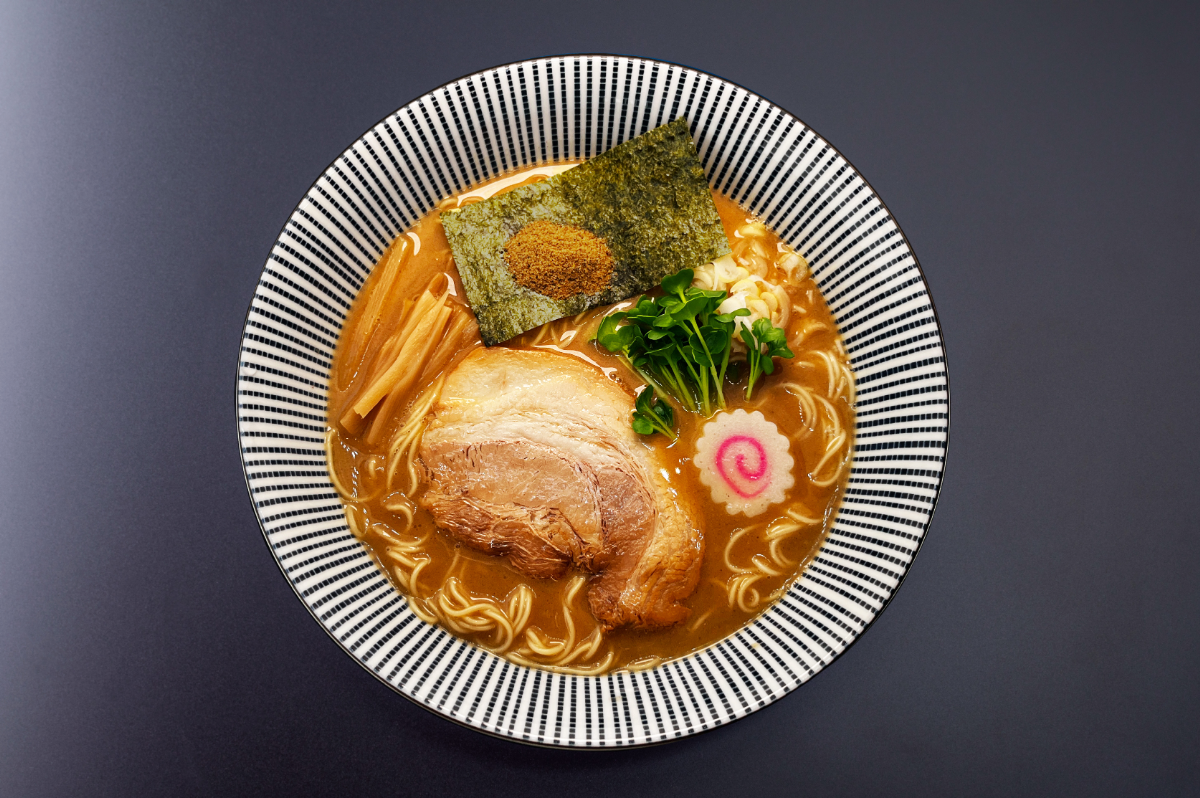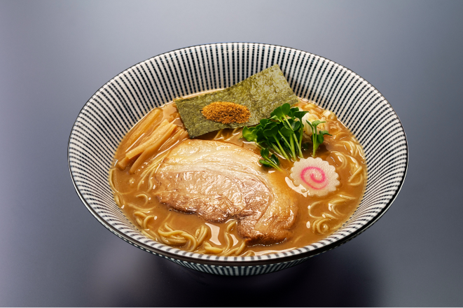 濃厚でコク深い旨みたっぷりの豚骨スープに最も合うように厳選したイワシの煮干、カツオなどの魚介の強い旨みと風味が特長の豚骨魚介ラーメンです。グイグイ引き込まれる魚介スープの滋味深い味わいで、気がついた時には飲み干している感動の一杯!!